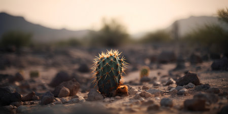 A brown cowboy hat lies on rocky terrain, surrounded by subtle desert flora. The soft sunlight creates a serene and rustic atmosphere in this outdoor scene.