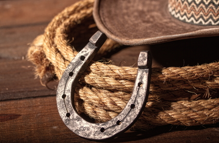 An old horseshoe lies next to a classic cowboy hat and lasso on a dark wooden background.
