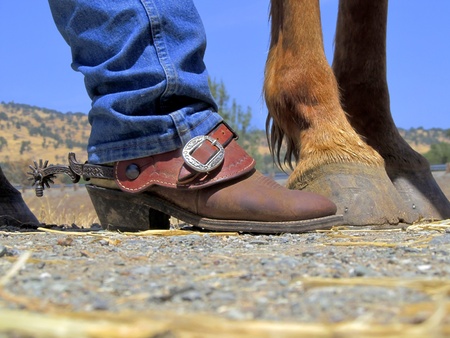 Rodeo cowboys' experienced boots & spurs on an iron rail (shallow focus, high contrast black & white effect)