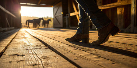 Silhouette of cowpoke boots steps on rustic wood, leading to horses grazing in golden light.