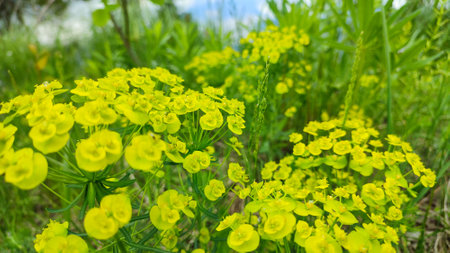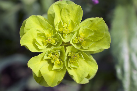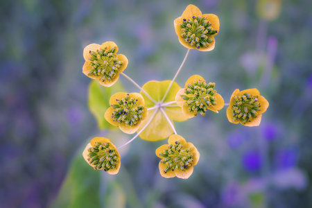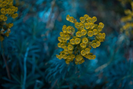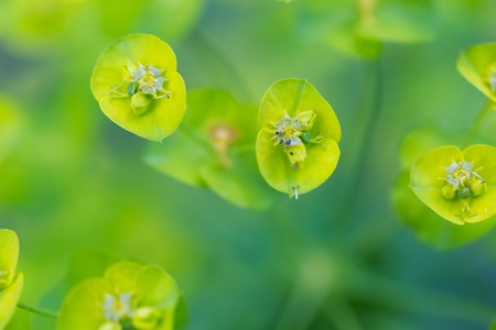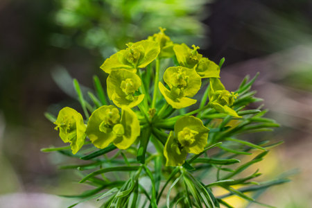 Macro shot of a beautiful Cypress Spurge (Euphorbia cyparissias) with blurry bokeh background