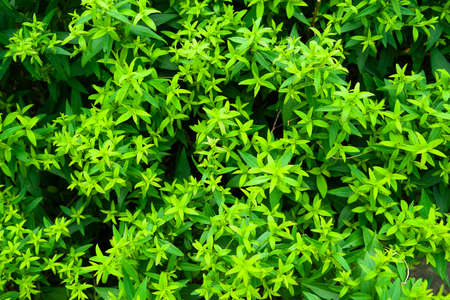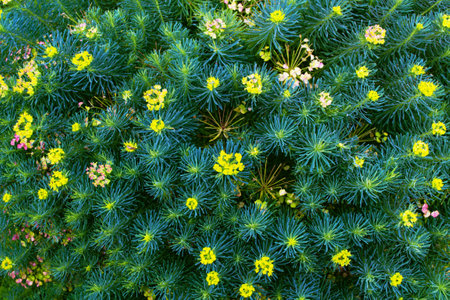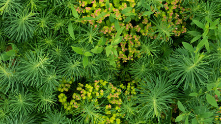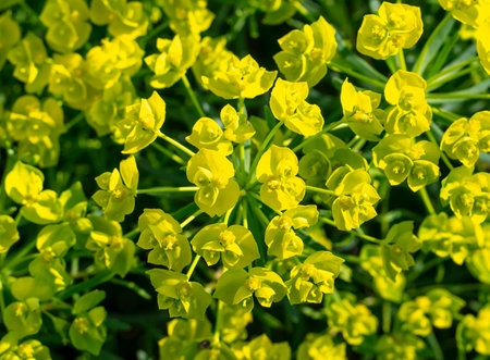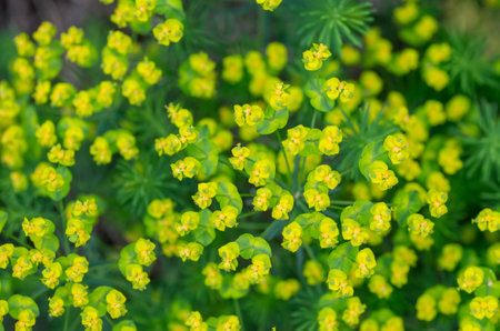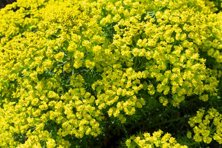 Euphorbia cyparissias, cypress spurge spring flowering herb. ornamental perennial in landscape design garden or park Abstract pattern Top view