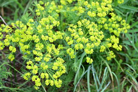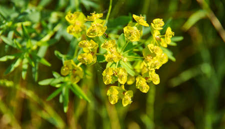 Flowers of a wild toxic plant Euphorbia cyparissias. Cypress Spurge / Euphorbia Cyparissis blooms among herbs. detail of cypress spurge flowers