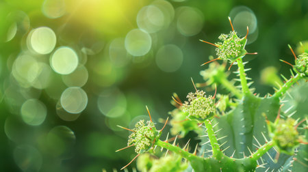 Close-up of a spiky green plant with delicate white blooms, set against a blurred green background with sunlit bokeh circles.