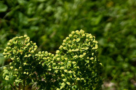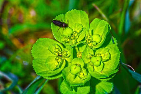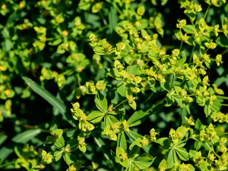 Spurge flowers (Euphorbia Amygdaloides). Beautiful green plant blooming in summer