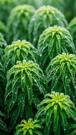 Lush green plant leaves are covered in glistening water droplets, creating a vibrant, refreshing, and detailed natural macro background.