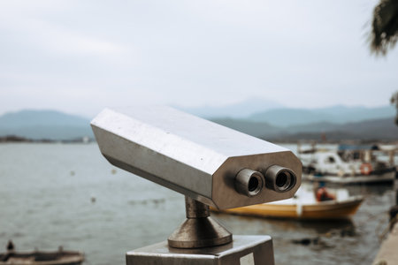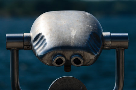 Public stationary binocular on sea shore, Coin operated metal binocular viewer on blurred background sea