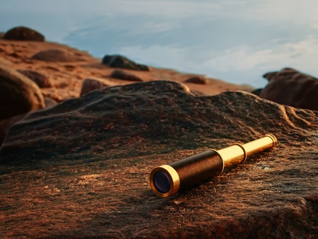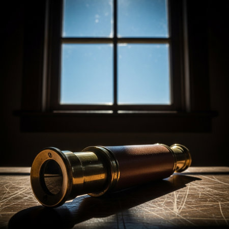 Antique brass spyglass telescope pointed toward the sky on a dusty table in harsh window light.