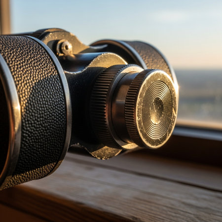 Vintage binoculars rest on a rustic wood surface, bathed in soft, natural light that showcases their details.
