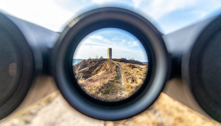 From a first-person perspective, a pair of binoculars brings a distant coastal landmark into sharp focus. This image captures a moment of discovery and focused observation, symbolizing the pursuit of goals, strategic planning, and the clarity that comes with a clear vision of the destination ahead.