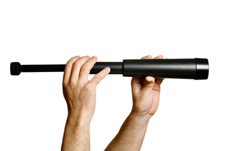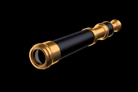 Spyglass or telescope on tripod stands by the window. Surveillance and peeping concept.
