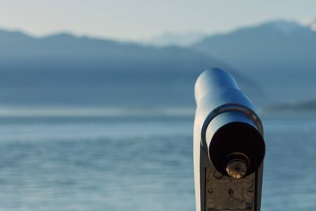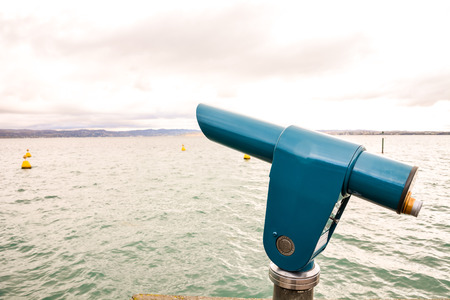 image of coin operated binoculars viewer in front of the sea landscape. vintage filtered