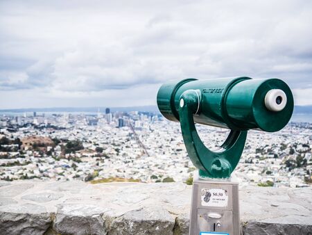 Close up of a tourist viewing telescope overlooking a town on a cloudy day with focus to the instrument