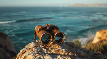 A pair of binoculars rests on a sturdy rock overlooking the ocean, where wind waves crash against the rocky shores and liquid water meets solid bedrock AIG50