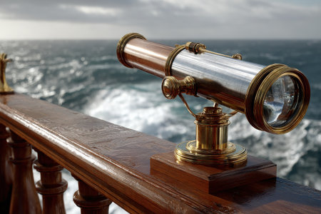 A brass telescope stands firmly on a wooden railing, facing the turbulent ocean waves. The scene captures a sense of adventure and exploration at sea.