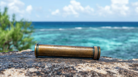 Antique brass telescope on map in sunlit room with ocean view. That the image is generated using AI.