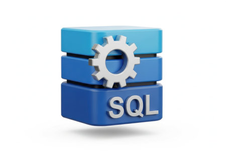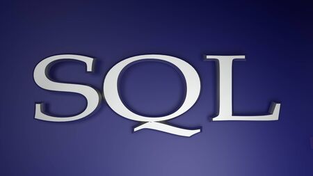 SQL word and SQL statements (Structured Query Language) code on a blue background. 3D illustration.