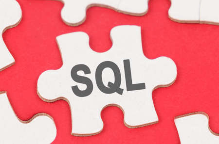 Internet and security. On a red background, among white puzzles lies a puzzle with the inscription - SQL