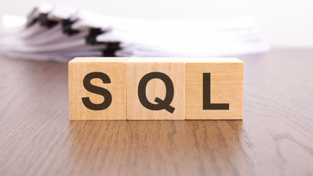 SQL letters on wooden cubes. the background is a white business papers. finance concept