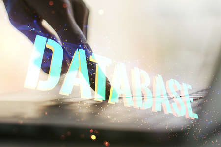 Double exposure of Database word sign with hands typing on computer keyboard on background, global research and analytics concept
