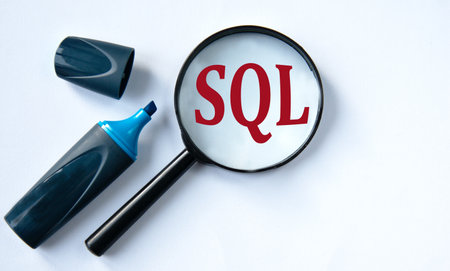 SQL (Structured Query Language) - acronym under a magnifying glass with a marker on a white background