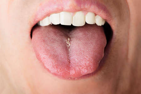 Male shows overgrowth candidiasis on his tongue