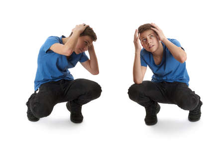 Cute teenager boy in blue T-shirt sitting and closing head with hands over white isolated background full body