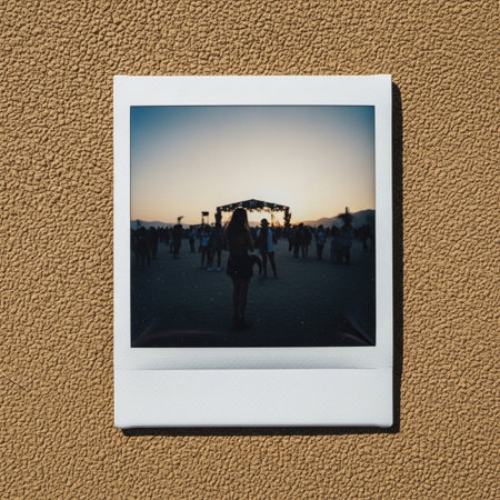 Colorful flat surface features scattered white polaroid frames arranged with open space for personal memories and creative expression in a fun setting.