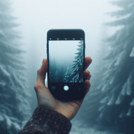 A person's hand holds a smartphone, displaying a breathtaking photo of a snow-covered mountain range and a frozen river.
