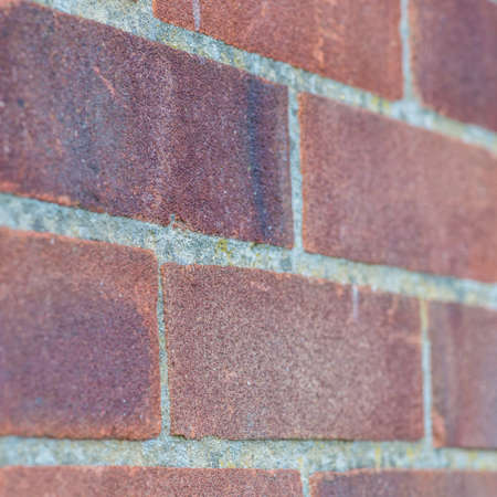Close up on red brick wall texture, focus on the middle of the wall. Background of the red brickwall close up. Red brick wall pattern.