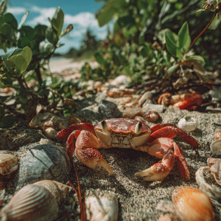 A close-up shot showcases a crab resting on a sandy surface, surrounded by seashells and green foliage. The scene is illuminated by bright sunlight, suggesting an outdoor setting. This image's natural tones and detailed textures make it suitable for various editorial and commercial applications. The composition draws focus to the crab.