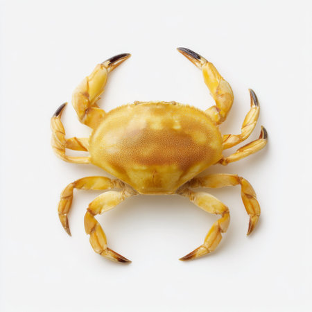 A detailed close-up view of a yellow crab on a white background, showcasing its intricate features and textures, perfect for food or nature themes.