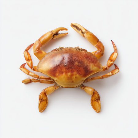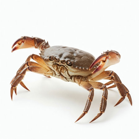 This image captures a brown crab resting on a white background, showcasing its intricate shell texture and vibrant colors, perfect for culinary or marine-themed projects.