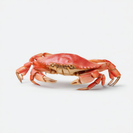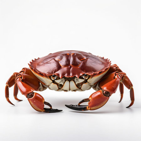 A bright red crab showcased on a clean white background, perfect for food photography. This image emphasizes the freshness and vibrant color of the crab, ideal for culinary presentations and recipe inspirations.