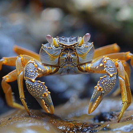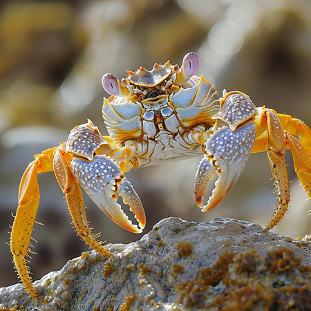 A close-up view of a crab on a rocky shoreline, surrounded by glistening water, showcasing the beauty of marine wildlife in a tranquil coastal environment.