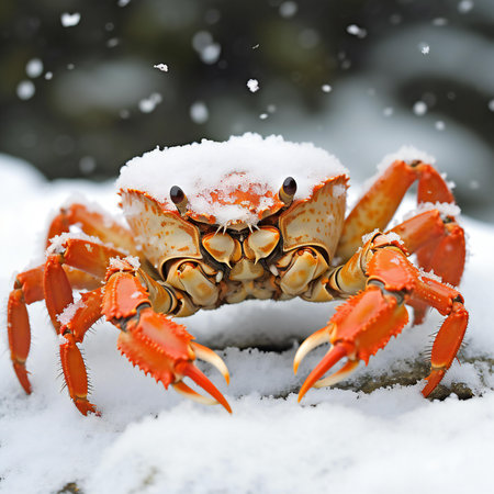 An AI-generated illustration of a beautiful red crab on a wet reflective surface.