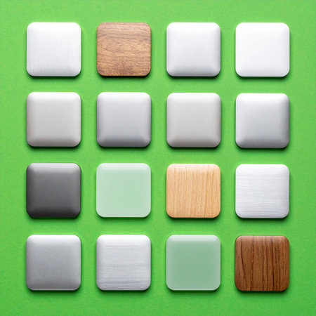 A curated selection of modern material samples, from smooth metals and natural woods to frosted glass, arranged in a perfect grid.
