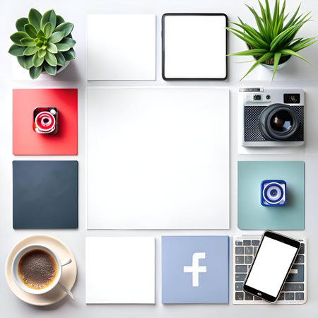 Minimalist flat lay of a modern workspace with social media icons. a camera. a tablet. and a cup of coffee. Perfect for bloggers. entrepreneurs. and marketers.