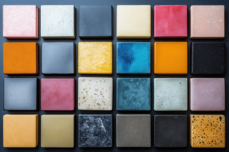 An intricate arrangement of various textured tiles is displayed in faded hues, creating an abstract and innovative design. The flat lay showcases creativity in material choice and color blending.