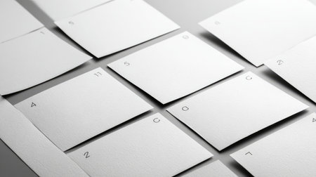 This image features a neat arrangement of blank white paper sheets with numbered cards, emphasizing minimalism and simplicity ideal for creative design and planning projects.
