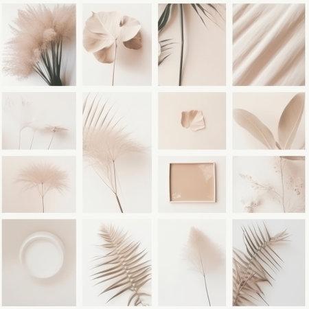 A flat lay composition featuring a grid of various items. including plants. cups. books. and even a person. This image is perfect for creating a mood board or showcasing a collection of diverse elements.