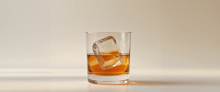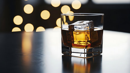 A glass of bourbon with a single ice cube rests on a polished surface. The rich amber liquid glimmers softly, creating an inviting atmosphere in an elegant setting.