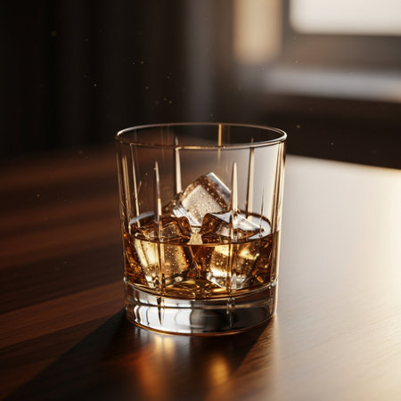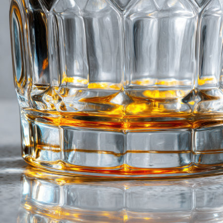 High detail macro of a clear glass tumbler showcasing stunning light reflections and rich amber liquid for a sophisticated aesthetic