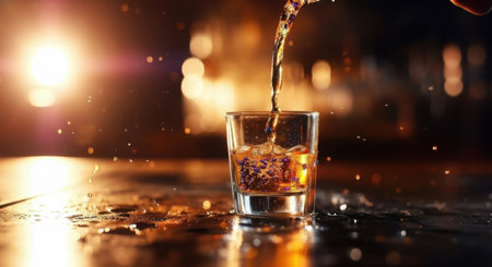 A close-up shot of amber liquid being poured into a clear shot glass, creating dynamic splashes and a bokeh background.