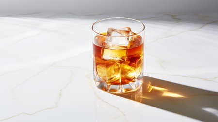 whiskey with ice cubes on a white marble table and black background