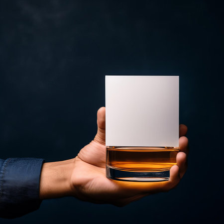 a whiskey bottle stands out against a plain navy background, its empty white label waiting for customization, grasped firmly by a passenger's hand, showcasing a high-detailed, ready-made mockup perfect for liquor branding, product design, and advertising concepts. ai generated