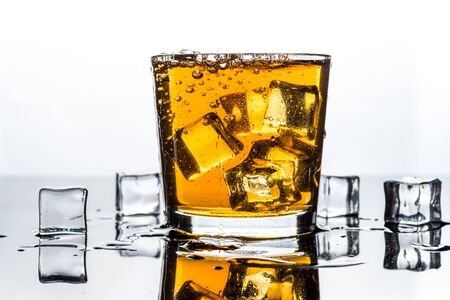 Whisky, whiskey or bourbon in glass with ice cubes on white reflection background