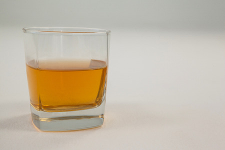 Close-up of glass of whisky on white background