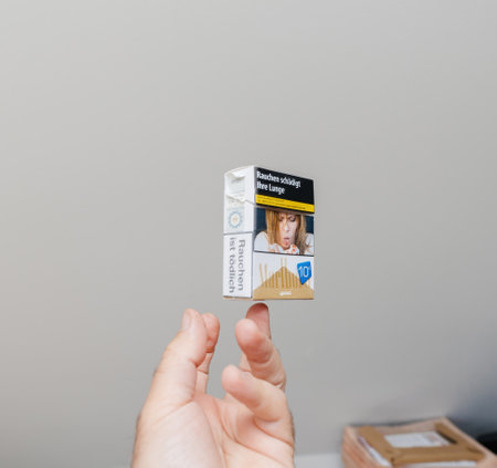 Marseille, France - Jul 30, 2020: POV of a male hand above a blue carpet holding a package of 3x20 mini toasts manufactured by Jacquet with a light blue background
