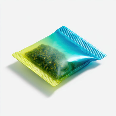 A vibrant and colorful transparent packaging holding herbal material, designed for modern storage solutions. Ideal for use in food and herbal markets.